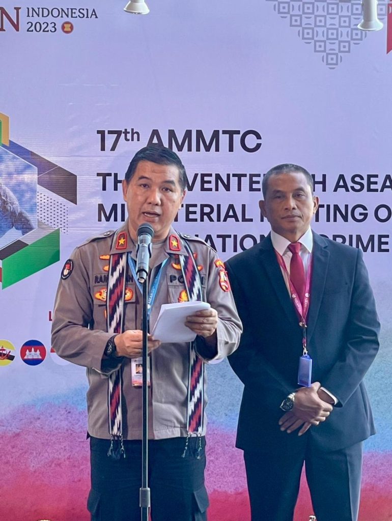 Karopenmas Divhumas Polri, Brigjen Pol. Ahmad Ramadhandi memberikan keterangan dalam press conference terkait pembukaan ASEAN Ministerial Meeting on Transnational Crime (AMMTC) ke-17 di Labuan Bajo, Nusa Tenggara Timur (NTT), Senin (21/8/2023). Pertemuan setingkat menteri ini diadakan dalam rangka menanggulangi kejahatan transnasional di kawasan ASEAN.