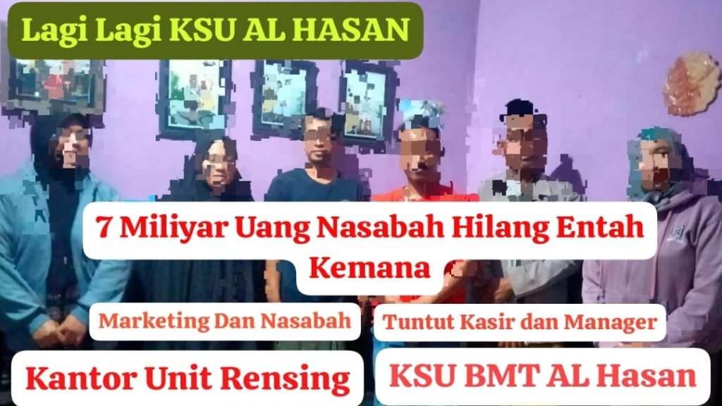 Beberapa marketing yang ada di Unit pelayanan Rensing,bersama seluruh nasabah di bawah binaan mereka menuntut KASIR (Ratna) juga Manager (Hamidah) untuk segera mencairkan Milyaran uang tabungan yang mereka kelola selama ini.Seperti yang kami ketahui bahwa pengelolaan keuangan selama ini dikelola oleh Kasir juga Manager dan rekening yang digunakan juga menggunakan rekening pribadi,ini parah sekelas Lembaga besar KSU BMT AL Hasan dengan jumlah aset serta pengelolaan keuangan puluhan Milyar kok bisa tidak punya Rekening Lembaga , atau jangan jangan ini sudah direncanakan jauh jauh hari niat jahat mereka untuk menyalahgunakan dan menyelewengkan bahkan mengkorupsikan uang tabungan para nasabah,”terang salah satu marketing unit rensing DA(Samaran)