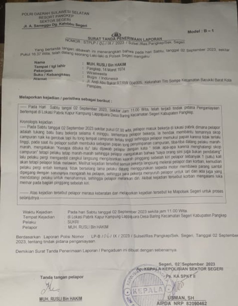 saksihukumindoesia.com -Pangkajene ~ Sudah beberapa hari ini pelaku tindak pidana penganiayaan di desa Baring,dusun lappa juara,Kecamatan Segeri Kabupaten Pangkep, diduga melarikan diri sampai berita ini kami naikkan pelaku belum diamankan di Polsek segeri.