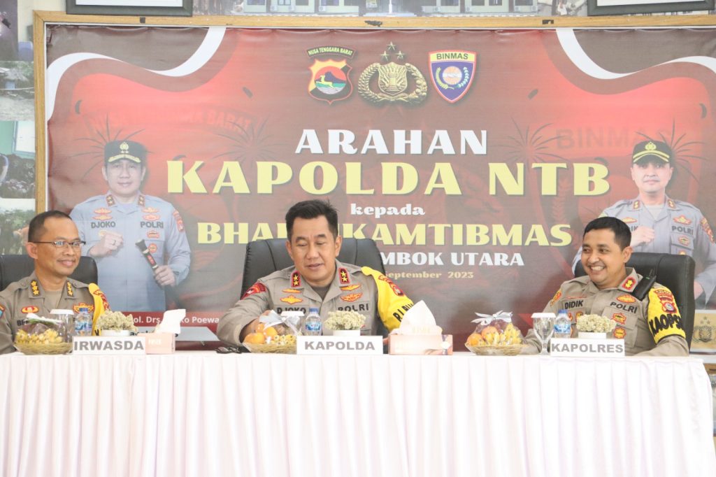 SAKSI HUKUM INDONESIA.COM, LOMBOK UTARA NTB – Kapolda NTB Irjen Pol. Drs. Djoko Poerwanto didampingi Kapolres Lombok Utara Akbp Didik Putra Kuncoro S.I.K.,M.Si. memberikan Arahan kepada Bhabinkamtibmas lingkup Polres Lombok Utara berlangsung di Aula Sarja Arya Racana Polres Lombok Utara, Jumat, (15/9/2023).