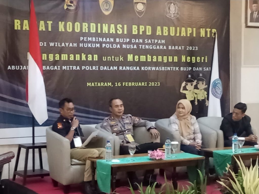 Dalam rapat tersebut, dibahas mengenai evaluasi kinerja ABUJAPI dan Pembinaan BUJP dan Satpam diwilayah Hukum Polda NTB dengan tema Mengamankan untuk membangun Negri di buka oleh Direktur Binmas Polda NTB yang diwakili oleh Kasubdit Binsatpam AKBP Iwan Sahrial, SE.