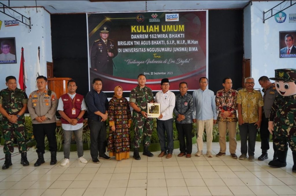 SAKSI HUKUM INDONESIA.COM ll KOTA BIMA NTB – Bertempat di Aula H. Djafar Amin Kampus Universitas Nggusuwaru (Unswa) Bima Jalan Tendean Kelurahan Mande Kecamatan Mpunda Kota Bima, Danrem 162/WB Brigjen TNI Agus Bhakti, S.I.P., M.I.P., M.Han., memberikan kuliah umum dengan tema “Tantangan Indonesia di Era Digital”, diikuti sekitar 231 orang. Jumat, ( 22/09/2023).