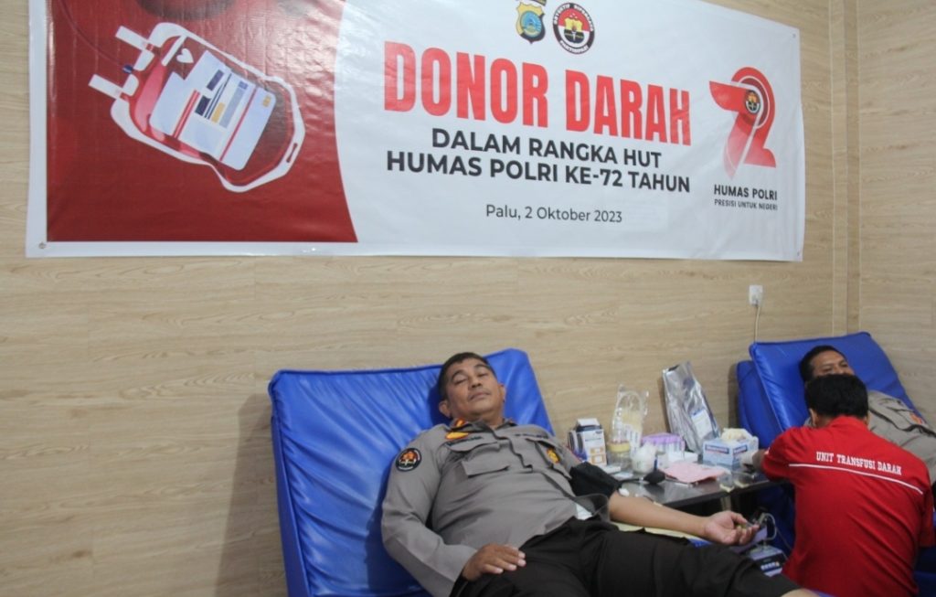 PALU, Menggandeng Palang Merah Indonesia (PMI) Sulawesi Tengah (Sulteng), Bidang humas (Bidhumas) Polda Sulteng menggelar donor darah di Palu, Senin (2/10/2023)