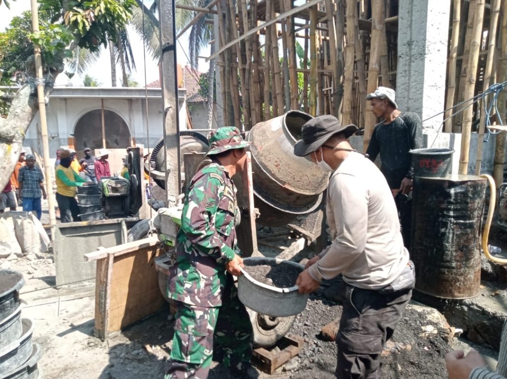 Babinsa Sikur Koramil 1615-09/Sikur Sertu Embang Hendra Yadi bersama Babinkamtibmas terlihat kompak serta memberikan semangat kepada masyarakat untuk bersatu padu bergotong royong pengecekan bagian atas pembangunan Masjid Haqqul Yakin di dusun setempat.
