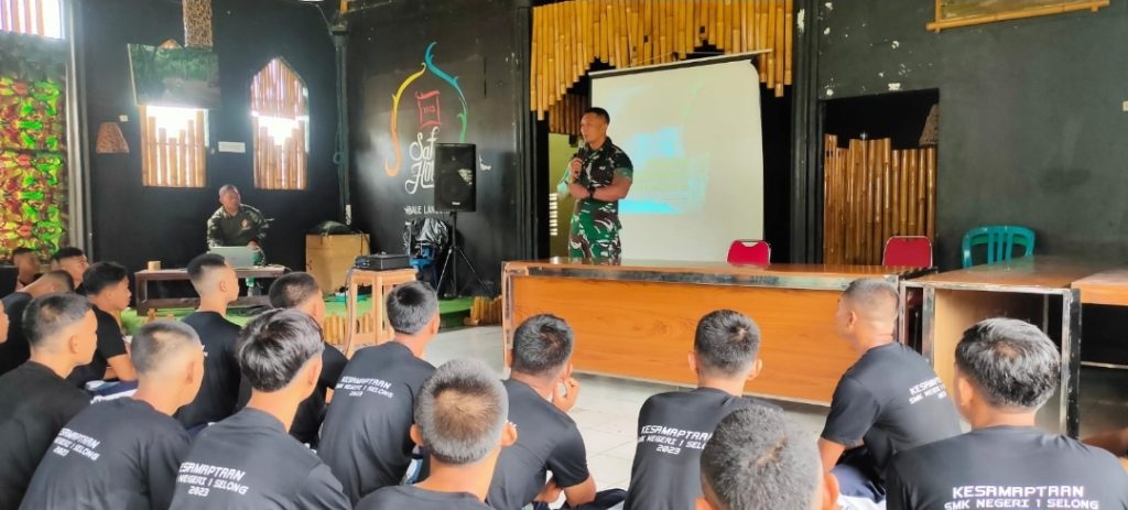 SAKSI HUKUM INDONESIA.COM ll LOMBOK TIMUR NTB – Komandan Kodim 1615/Lotim Letnan Kolonel Inf Bayu Sigit Dwi Untoro memberikan ceramah Penguatan Wawasaan Kebangsaan kepada siswa-siswi SMK Negeri 1 Selong di Bale Langgak Makodim jalan Prof. M. Yamin Selong Lombok Timur, Jumat (17/11).