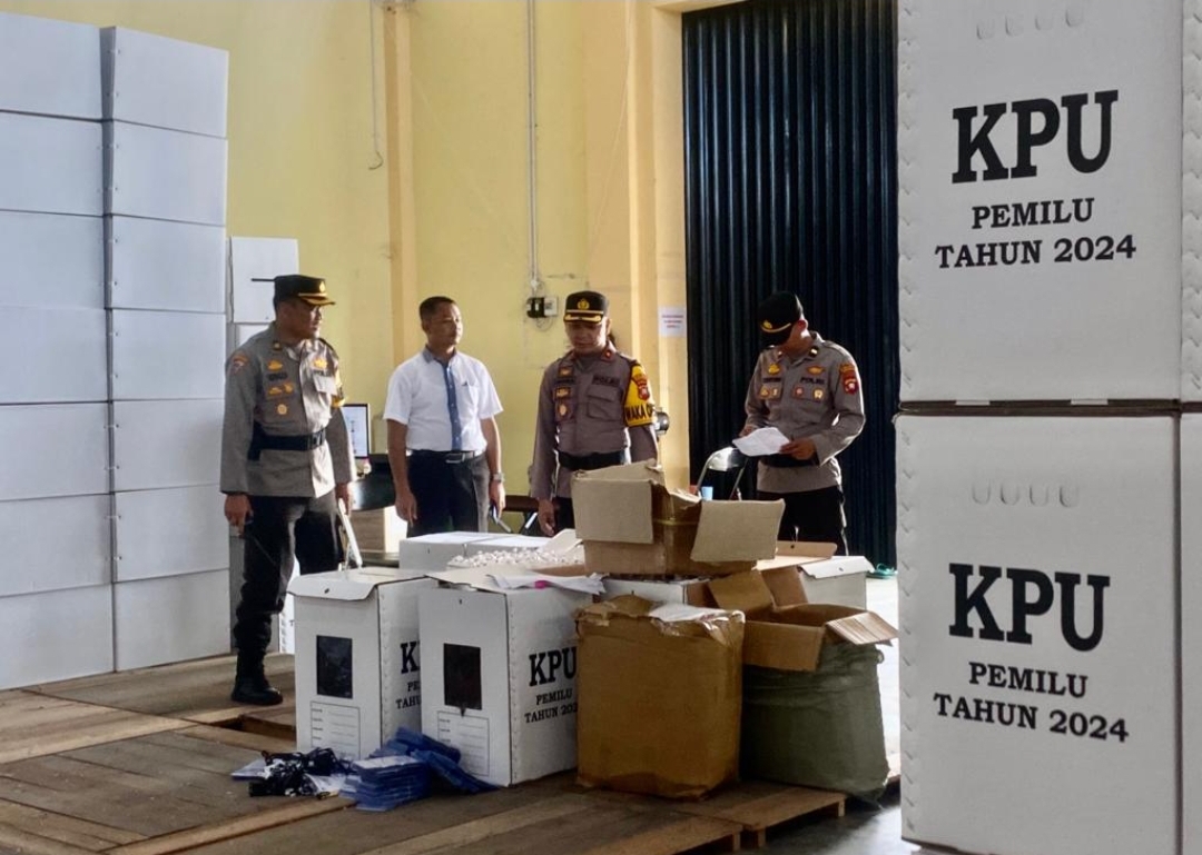 SINGKAWANG, Polda Kalbar- Polres Singkawang, Waka Ops Res Kompol Indra Asrianto, S.I.K., M.A.P. bersama Pejabat Operasi Mantap Brata Kapuas 2023-2024 Polres Singkawang melakukan pengecekan gudang logistik KPU di Jalan P. Antasari Kel. Pasiran Kec. Singkawang Barat Kota Singkawang, Senin (4/12/2023).
