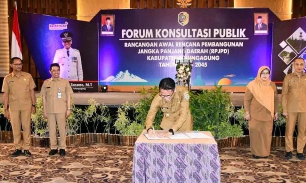 Seusai pembukaan Forum Konsultasi Publik dilanjutkan dengan penandatanganan Berita Acara Kesepakatan FKP RPJPD Kabupaten Tulungagung Tahun 2025 – 2045.(Ft)