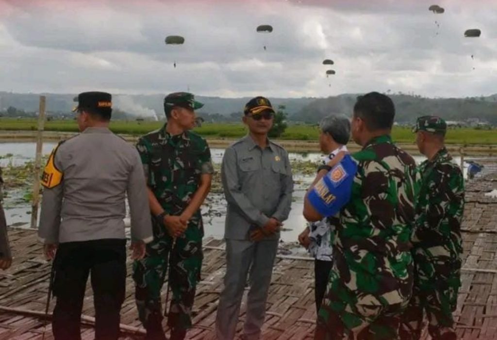 Tulungagung,- Sekretaris Daerah Kabupaten Tulungagung Drs. Sukaji, M.Si., bersama Kapolres Tulungagung AKBP Teuku Arsya Khadafi SIK SH. M.Si., Dandim 0807 Tulungagung Letkol Czq Nooris Agus Rinanto S.I.P, Kepala Kejaksaan Negeri Tulungagung Ahmad Muchlis SH, MH., menyaksikan secara langsung atraksi terjun payung TNI AU Anggota Militer Yonif 501 bertempat di Telaga Bedalem Desa Besole Kecamatan Besuki Tulungagung pada Kamis 07/12/2023.