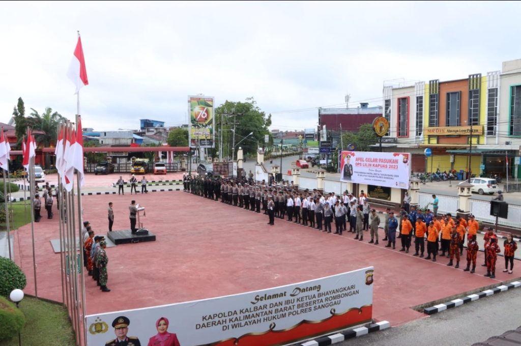 Apel Gelar Pasukan Ops Lilin Kapuas 2023 dilaksanakan sebagai bentuk kesiapan dalam pengamanan Natal 2023 dan Tahun Baru 2024 di Wilkum Polres Sanggau