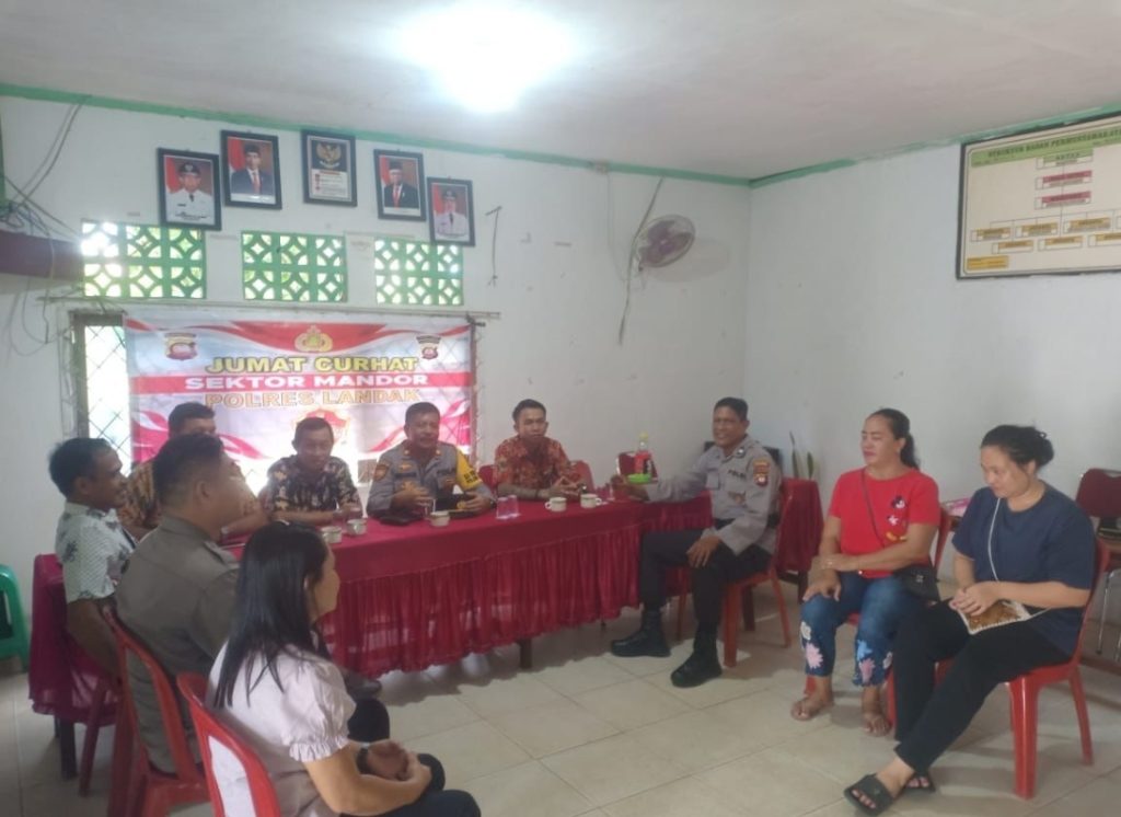 Polres Landak – Mandor, Polsek Mandor menggelar Jumat Curhat program ini merupakan sarana untuk menampung seluruh aspirasi masyarakat diharapkan dengan melalui Jumat Curhat yang digelar rutin ini dapat menekan gangguan Kamtibmas di Kecamatan Mandor.