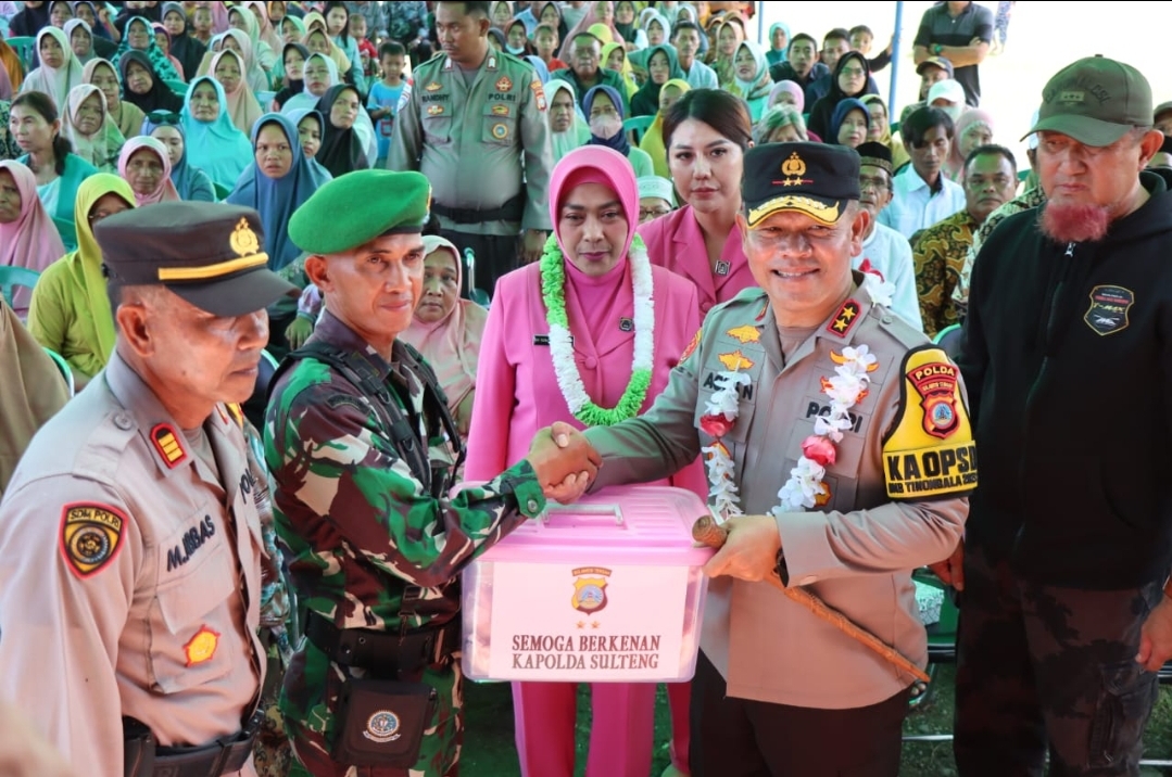 Kapolda juga menyerahkan secara simbolis bansos paket sembako, kursi roda untuk masyarakat penyandang disabilitas, dan solar cell (pembangkit listrik tenaga surya) kepada masyarakat di wilayah Kecamatan Una Una.