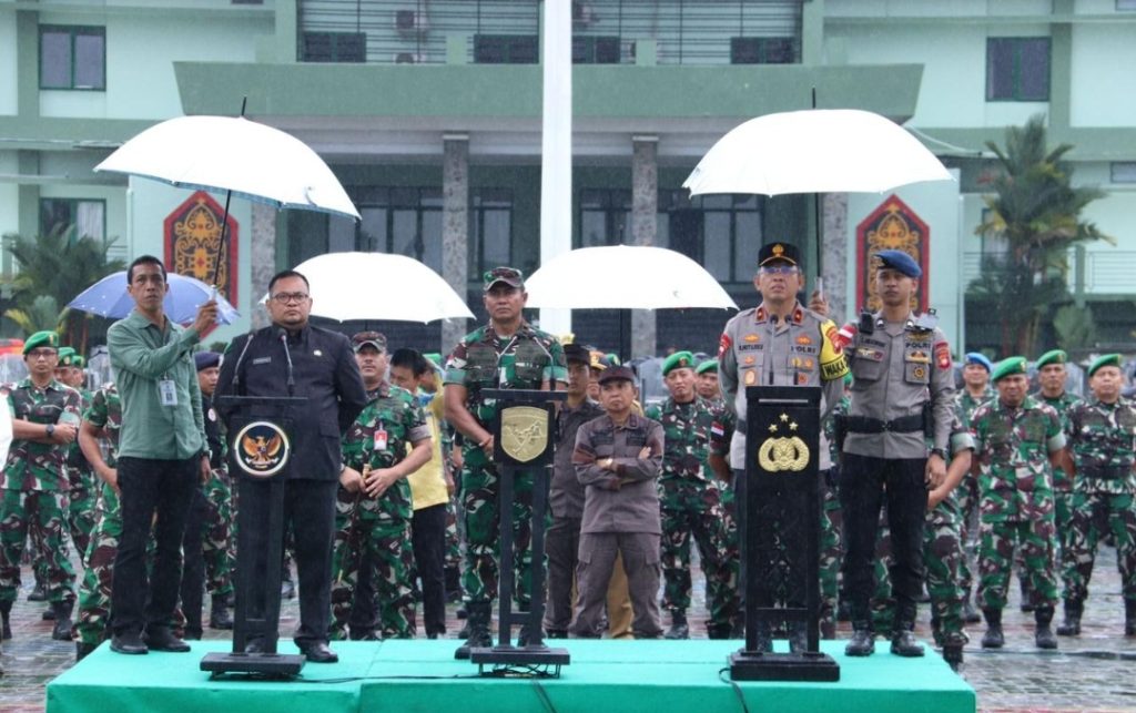 Pontianak, Polda Kalbar – Wakapolda Kalbar Brigjen Pol Roma Hutajulu, S.I.K., M.Si., didampingi Karoops Polda Kalbar Kombes Pol Moch Noor Subchan, S.I.K., M.H., Kapolres Kubu Raya AKBP Wahyu Jati Wibiwo, S.I.K., S.H., M.H., dan Wakapolresta Pontianak Kota AKBP N.B. Dharma, S.I.K., menghadiri Apel Gelar Pasukan Pengamanan Pemilu 2024 yang diselenggarakan di Lapangan Tidayu Makodam XII/Tpr pada hari Kamis, 1 Februari 2024, pukul 08.00 WIB.
