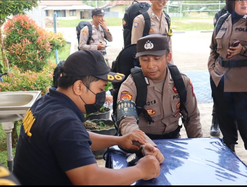 SINGKAWANG, Polda Kalbar- Polres Singkawang, Menjelang Pengamanan TPS Guna memastikan Kesehatan Personil dalam keadaan Sehat, Personel yang terlibat dalam Operasi Mantap Brata (OMB) Polres Singkawang dilakukan Pemeriksaan Kesehatan oleh Satuan Tugas Bantuan Operasi ( Satgas Banops) Subsatgas Yankes di Mako Polres Singkawang, Senin (5/2/2024).