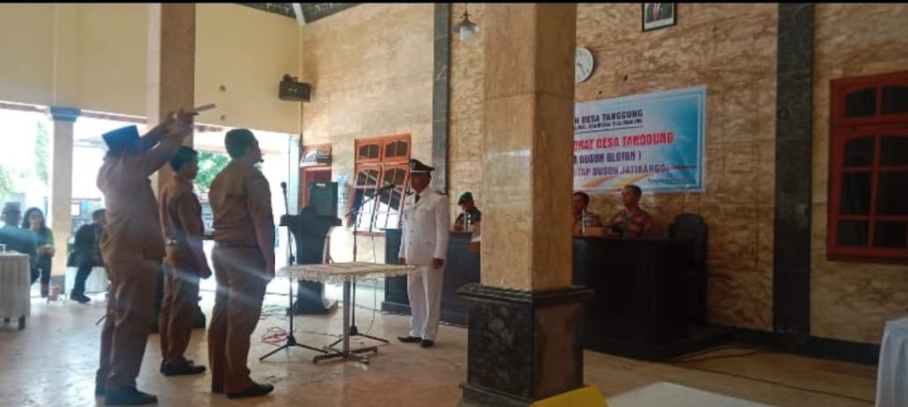 Tulungagung,- Bertempat di balai desa Tanggung kecamatan Campurdarat kabupaten Tulungagung pada Selasa pagi (20/2/2024) pemerintah desa Tanggung melaksanakan pengambilan sumpah dan pelantikan perangkat desa.