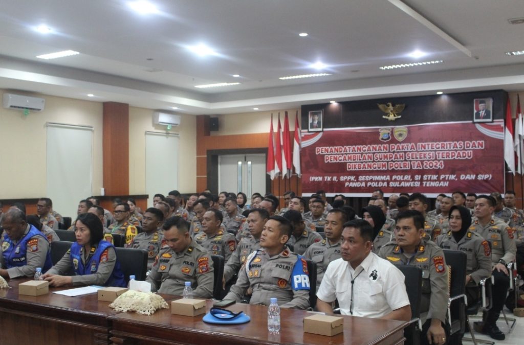 “Pelaksanaan pengambilan sumpah dan penanda tanganan Pakta Integritas menandai dimulainya seleksi Dikbangum Polri T.A 2024 di Polda Sulteng,” kata Kabidhumas Polda Sulteng Kombes Pol. Djoko Wienartono di Palu, Senin (26/2/2024)