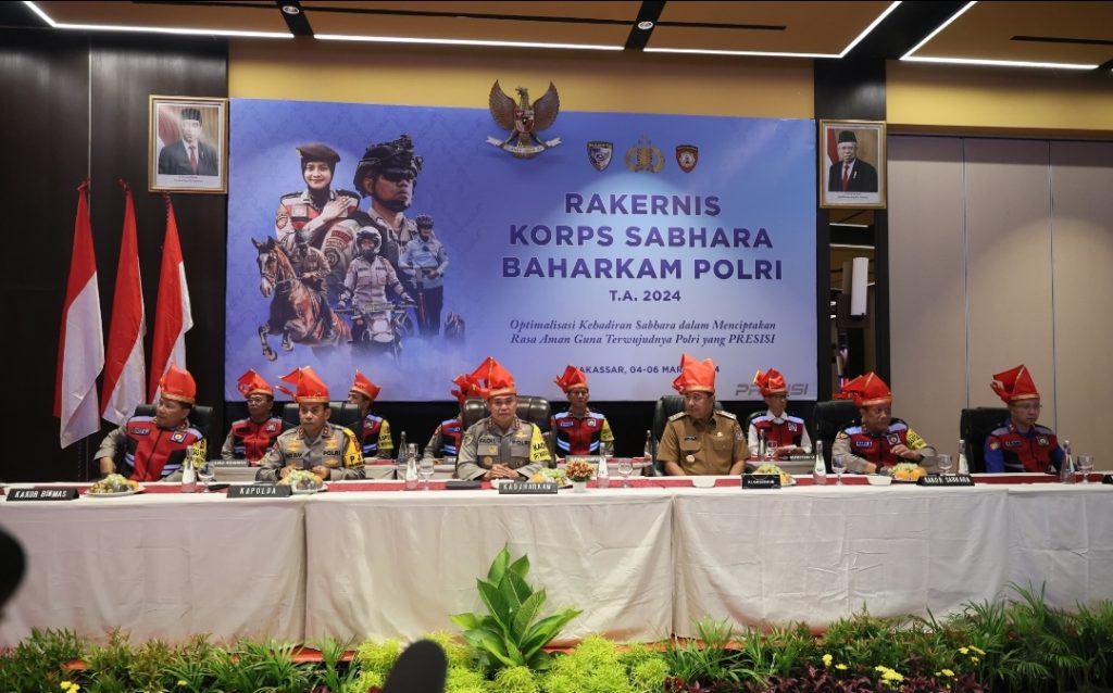 Kapolda sulsel Irjen Pol Andi Rian R Djajadi, S.I.K., M.H bersama sejumlah PJU Polda Sulsel hadir dipembukaan Rakernis Korsabhara Baharkam Polri T.A 2024 yang dibuka Langsung Oleh Kabaharkam Polri di Ballroom The Rinra Hotel, Makassar, Selasa (05/03/24).