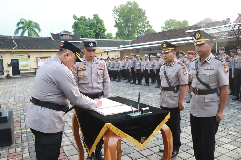 Diawali dengan pembacaan Teks Pengambilan Sumpah oleh Kapolresta Mataram diikuti pejabat Serah Terima diambil didampingi Rohaniawan masing-masing dan penandatangan naskah berita acara Sertijab, Paakta Integritas dan Berita Acara Pengambilan Sumpah.