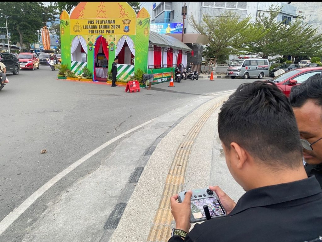 PALU, -Satgas Humas Operasi Ketupat Tinombala-2024 gunakan drone untuk memantau dan merekam arus lalu lintas dan aktifitas masyarakat dibeberapa titik di Kota Palu, Sulawesi Tengah, Minggu (7/4/2024) sore.