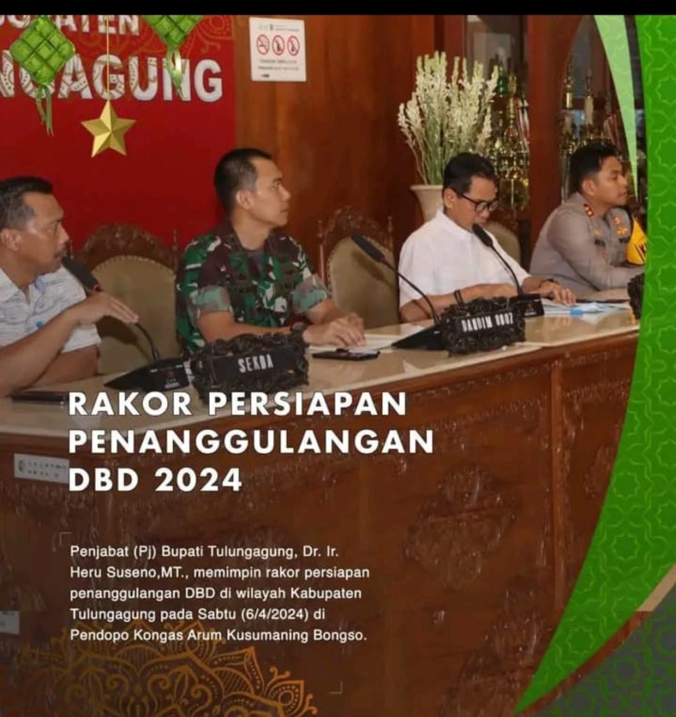 Tulungagung,- Dengan meningkatnya kasus DBD di Kabupaten Tulungagung serta guna antisipasi penyebaran penularan DHF akibat mobilitas masyarakat pada saat lebaran, dilaksanakan rakor persiapan penanggulangan DBD di wilayah Kabupaten Tulungagung pada Sabtu (6/4/2024) di Pendopo Kongas Arum Kusumaning Bongso.