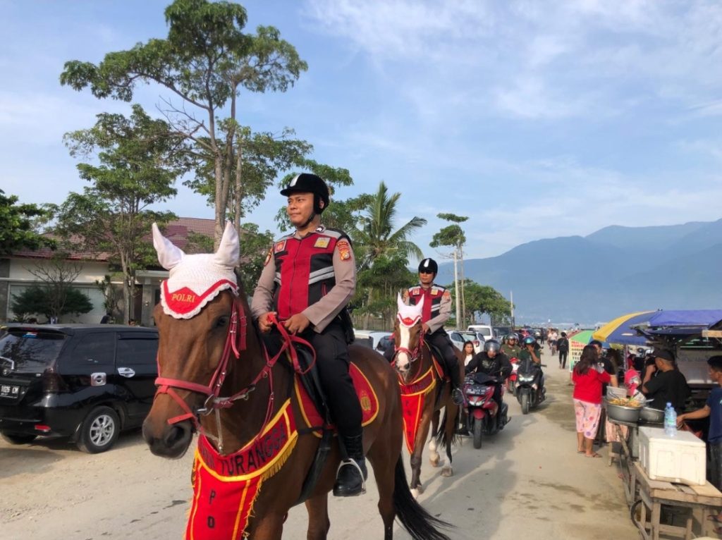 Patroli berkuda memantau dan menyapa masyarakat di sepanjang pesisir pantai talise Palu. Kegiatan merekapun berlanjut untuk melihat dari dekat situasi dan kondisi rumah kosong yang ditinggal pemiliknya mudik lebaran.