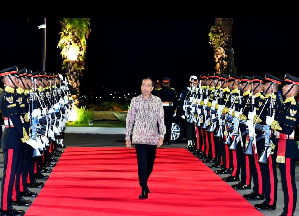 Presiden Jokowi yang mengenakan kemeja kain tenun sintang tiba di GWK, sekitar pukul 18.50 WITA. Presiden Jokowi kemudian menyambut kedatangan para tamu seraya berfoto bersama sebelum memasuki area jamuan.