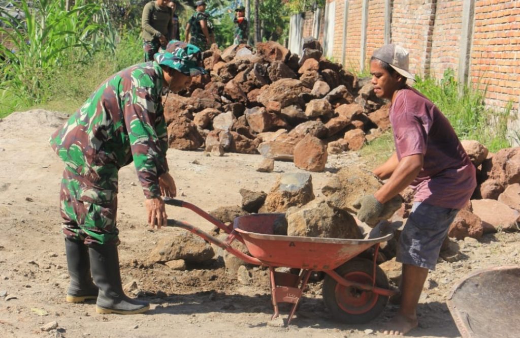 Sejak pagi hari, anggota TNI bersama warga setempat bekerja bahu-membahu untuk mengangkut dan menata material yang dibutuhkan untuk pembangunan talud irigasi. Talud ini nantinya akan berfungsi untuk memperkuat aliran air irigasi sehingga dapat mengoptimalkan distribusi air ke lahan pertanian warga.
