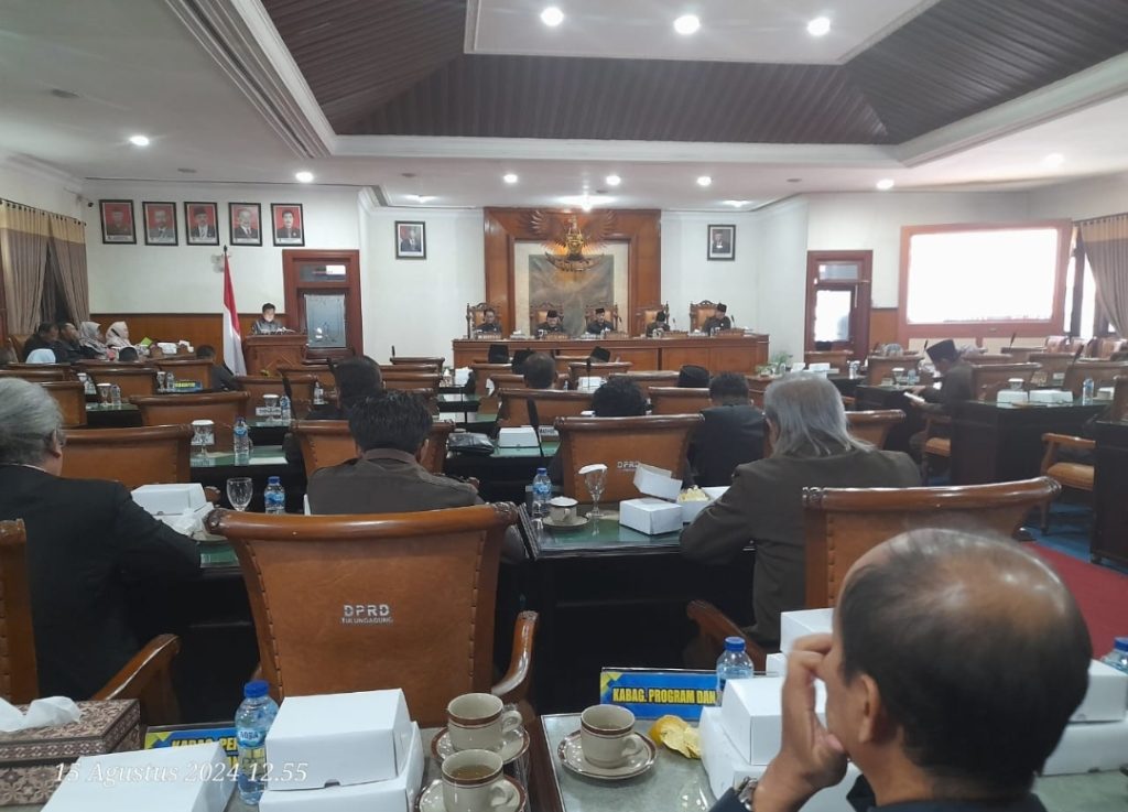 Tulungagung – DPRD Tulungagung menggelar rapat paripurna persetujuan bersama Kepala Daerah dan DPRD terhadap Ranperda tentang Perubahan APBD tahun anggaran 2024. Rapat ini dilaksanakan di Gedung Graha Wicaksana pada Kamis (15/8/2024).