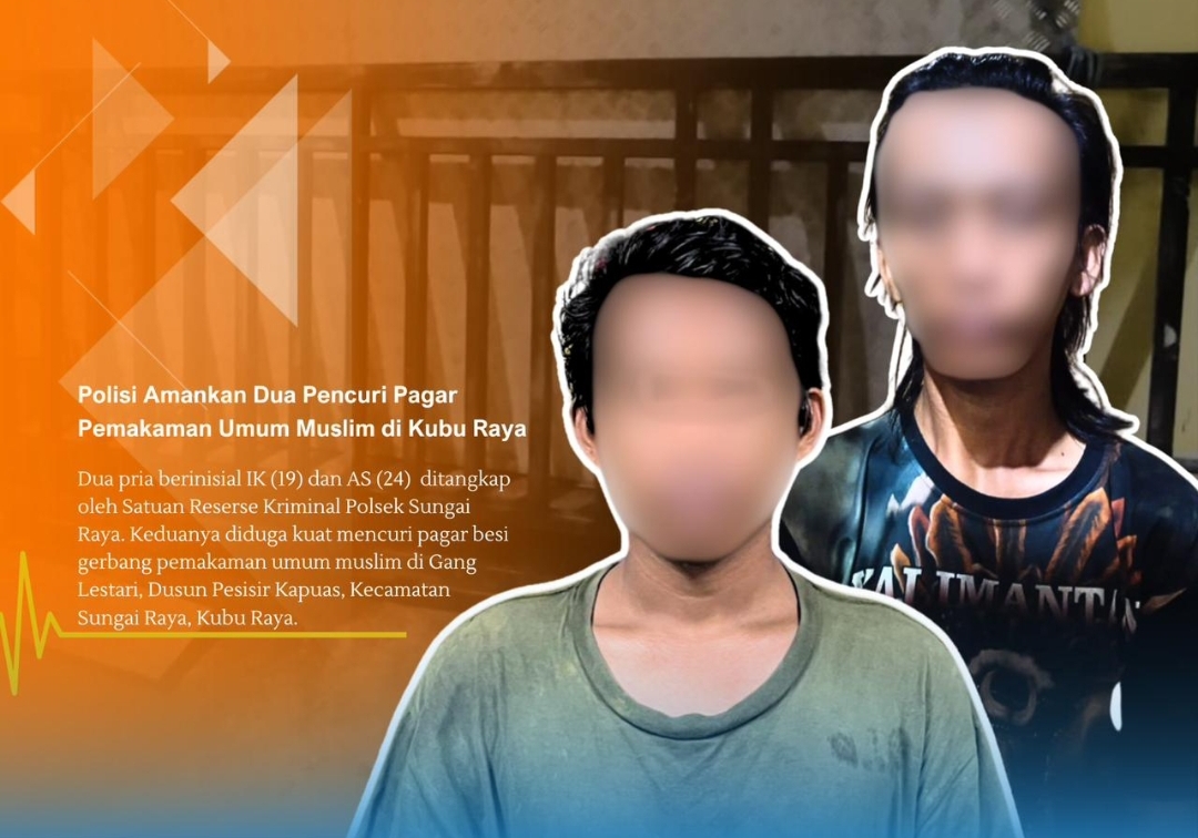 Dua pria berinisial IK (19) dan AS (24) harus berurusan dengan pihak berwajib setelah ditangkap oleh Satuan Reserse Kriminal Polsek Sungai Raya. Keduanya diduga kuat mencuri pagar besi pemakaman umum muslim di Gang Lestari, Dusun Pesisir Kapuas, Kecamatan Sungai Raya, Kubu Raya.