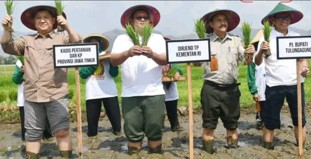 Tulungagung,- Pj Bupati Tulungagung Dr. Ir. Heru Suseno, M.T. mendampingi Direktur Perlindungan Tanaman Pangan Kementrian Pertanian RI Rahmad S.Si,M.Si melakukan Gerakan Percepatan Tanam Padi Kabupaten Tulungagung di area persawahan Desa Kiping Kecamatan Gondang pada Kamis (26/09/2024).