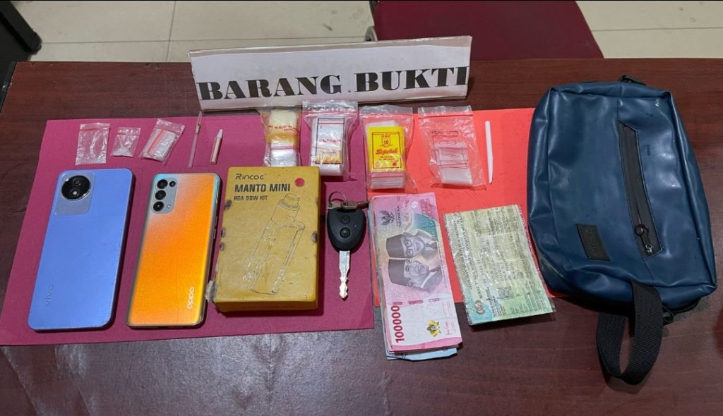 Saat dilakukan penggeledahan terhadap tersangka, petugas menemukan satu unit ponsel merek Vivo warna Orchid Blue di tangan kanan tersangka. Penggeledahan di dalam rumah tersebut juga menemukan satu plastik klip transparan berisi kristal putih yang diduga narkotika jenis sabu di ruang tengah. Selain itu, di dalam kamar, tepatnya di lantai, petugas menemukan satu kotak warna kuning bertuliskan “MANTO MINI” yang berisi satu plastik klip berisi kristal diduga sabu, dua sendok dari potongan pipet, serta satu plastik klip berisi enam plastik klip kosong.
