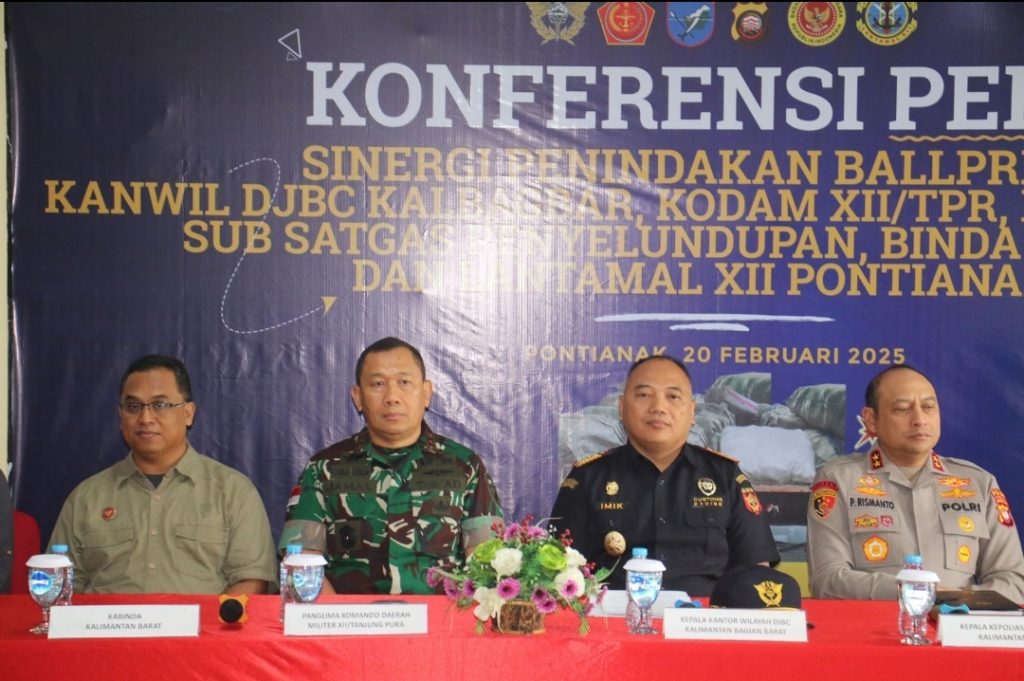 Pontianak – Pangdam XII/Tanjungpura, Mayjen TNI Jamallulael, S.Sos., M.Si., menghadiri konferensi pers di Kantor Wilayah Direktorat Jenderal Bea dan Cukai (DJBC) Kalimantan bagian Barat (Kalbagbar), Jalan Pak Kasih, Kota Pontianak, Kamis (20/2/2025).