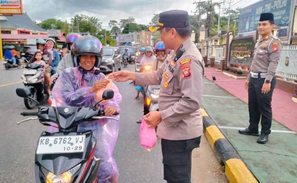 Sebanyak 150 paket takjil dibagikan kepada para pengguna jalan, termasuk pengendara roda dua maupun roda empat, sebagai bentuk kepedulian Polri terhadap masyarakat yang sedang menjalankan ibadah puasa.