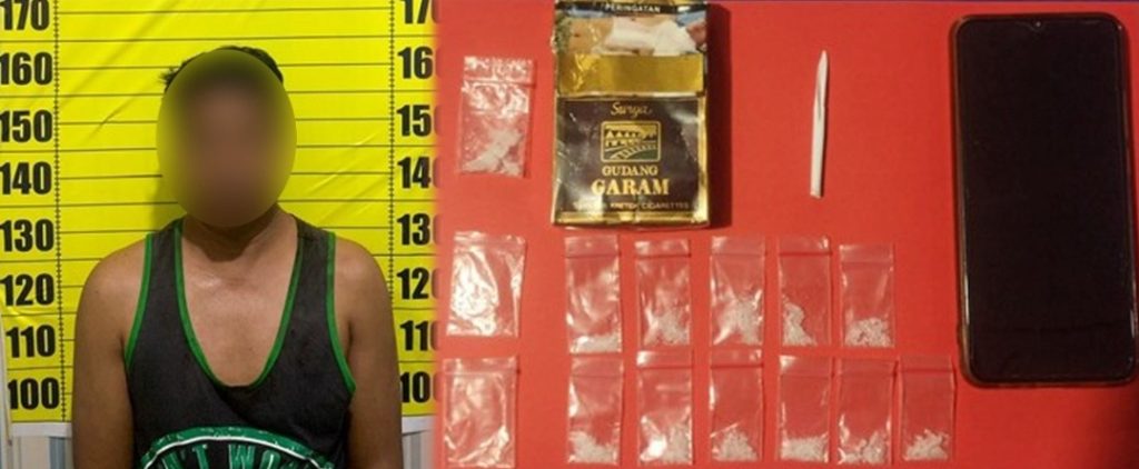 Dari hasil penggeledahan, ditemukan 12 paket plastik bening berklip yang berisi kristal putih diduga narkotika jenis sabu, satu kotak rokok Surya warna coklat, satu sendok sabu yang terbuat dari pipet plastik, serta sebuah unit handphone merk Oppo warna biru.