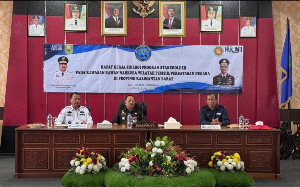 Sanggau, Polda Kalbar – Dalam upaya memperkuat sinergi lintas sektor guna menanggulangi peredaran dan penyalahgunaan narkoba di wilayah pesisir dan perbatasan negara, Badan Narkotika Nasional Republik Indonesia (BNN RI) bersama Pemerintah Kabupaten Sanggau menggelar Rapat Kerja Sinergi Program Stakeholder Penanganan Narkoba pada Kamis (3/7/2025), bertempat di Ruang Pertemuan Babai Cinga, Kantor Bupati Sanggau.