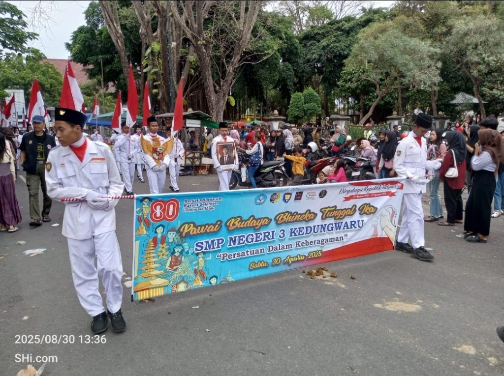 Tulungagung,-Ribuan warga memadati pusat Kota Tulungagung, Sabtu (30/8/2025), untuk menyaksikan kemeriahan Pawai Budaya memperingati HUT ke-80 Kemerdekaan Republik Indonesia. SMPN 3 Kedungwaru menjadi salah satu peserta yang mencuri perhatian dengan suguhan budaya yang kaya, meriah, dan sarat pesan kebangsaan.
