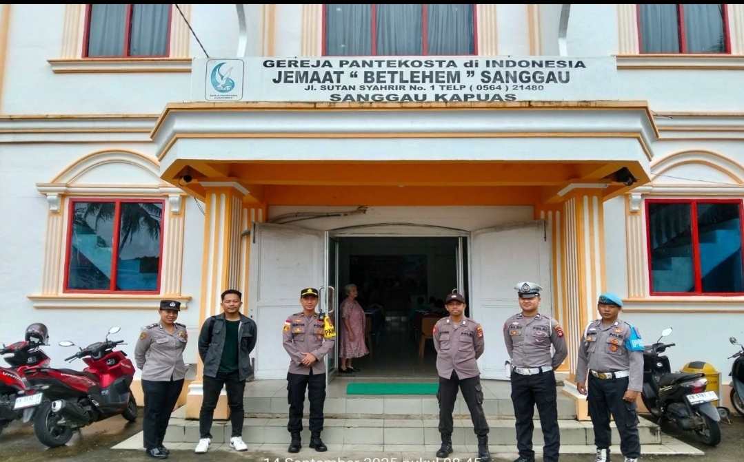 Sanggau, Polda Kalbar – Polres Sanggau menggelar pengamanan ibadah Misa dan Kebaktian Minggu di berbagai gereja di Kota Sanggau pada Minggu, 14 September 2025. Pengamanan dilakukan oleh Pleton Siaga Regu III dengan tujuan memastikan jalannya kegiatan ibadah berlangsung aman, tertib, dan lancar.