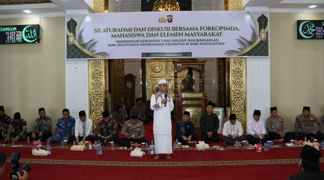 Pontianak _ Guna membangun Demokrasi yang Inklusif dan Berkeadilan demi terciptanya Harmonisasi kehidupan di Bumi Khatulistiwa, Polda Kalbar laksanakan silaturahmi dan Diskusi bersama Forkopimda, Mahasiswa, Dan Elemen Masyarakat, bertempat di Masjid An-Nur Polda Kalbar. (Jumat, 19/9/2025)