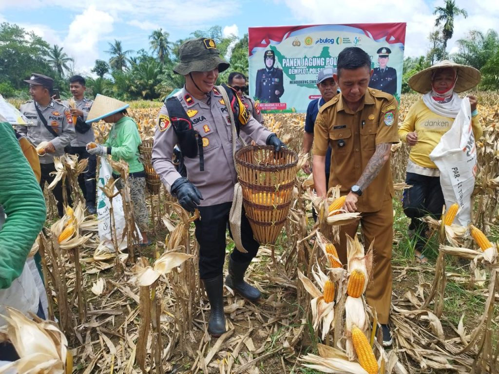 Polres Landak Polsek Mempawah Hulu Polda Kalbar melaksanakan panen perdana jagung di lahan Demplot Polsek Mempawah Hulu di Dusun Muara Desa Tunang, selasa 14/10/25.