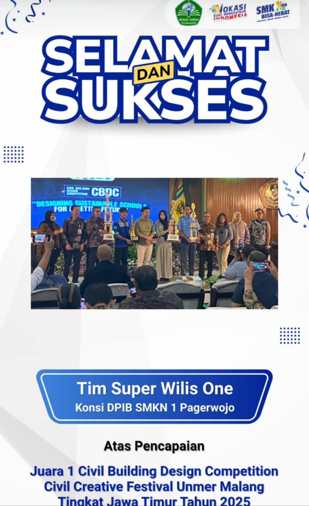 Tulungagung,-SMKN 1 Pagerwojo kembali menorehkan prestasi gemilang di tingkat provinsi. Tim Super Wilis One, yang terdiri dari siswa-siswi Komsi DPIB (Desain dan Perancangan Bangunan) SMKN 1 Pagerwojo, berhasil meraih Juara 1 dalam Civil Building Design Competition pada ajang Civil Creative Festival 2025 yang diselenggarakan oleh Universitas Merdeka Malang. Prestasi ini mengukir kebanggaan tidak hanya bagi sekolah, tetapi juga bagi dunia pendidikan kejuruan di Jawa Timur.