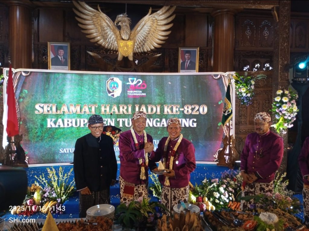 TULUNGAGUNG,-Puncak peringatan Hari Jadi ke-820 Kabupaten Tulungagung berlangsung khidmat dan penuh nuansa adat di Pendopo Kongas Arum Kusumaning Bongso, Selasa (18/11/2025). Pada momen bersejarah ini, Bupati Tulungagung Gatut Sunu Wibowo memimpin secara langsung dua prosesi inti yang menjadi simbol utama peringatan hari jadi, yaitu penyerahan Pataka Lambang Daerah dan pemotongan tumpeng sebagai ungkapan syukur atas perjalanan panjang pemerintahan Tulungagung.