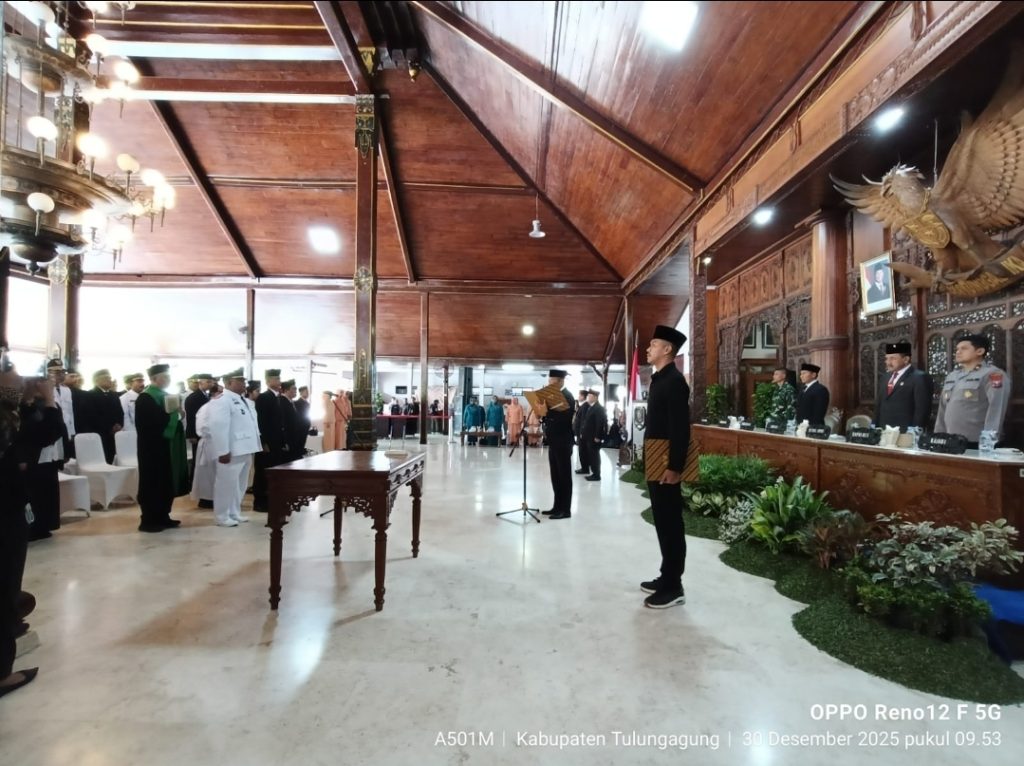 TULUNGAGUNG,-Bupati Tulungagung Gatut Sunu Wibowo melantik dan mengambil sumpah/janji jabatan terhadap 141 pejabat administrator dan pejabat pengawas di lingkungan Pemerintah Kabupaten Tulungagung. Pelantikan dilaksanakan pada Selasa, 30 Desember 2025, bertempat di Pendopo Kabupaten Tulungagung, dan berlangsung dengan khidmat.