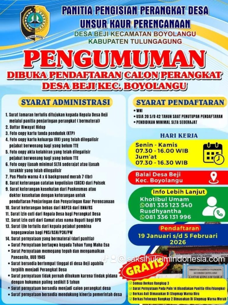 TULUNGAGUNG,-Pemerintah Desa Beji melalui Panitia Pengisian Perangkat Desa secara resmi mengumumkan dibukanya pendaftaran calon Perangkat Desa Beji untuk jabatan Kepala Urusan (Kaur) Perencanaan.