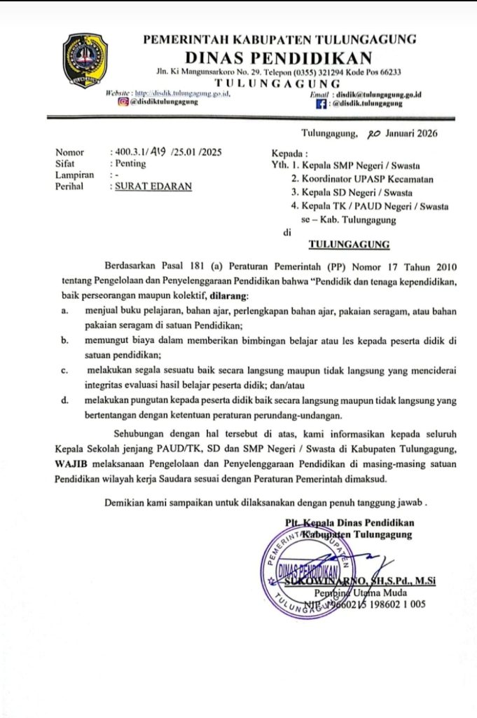 Surat edaran ini sekaligus menjadi ujian keseriusan dunia pendidikan di Tulungagung. Apakah benar-benar berbenah, atau hanya formalitas administratif?