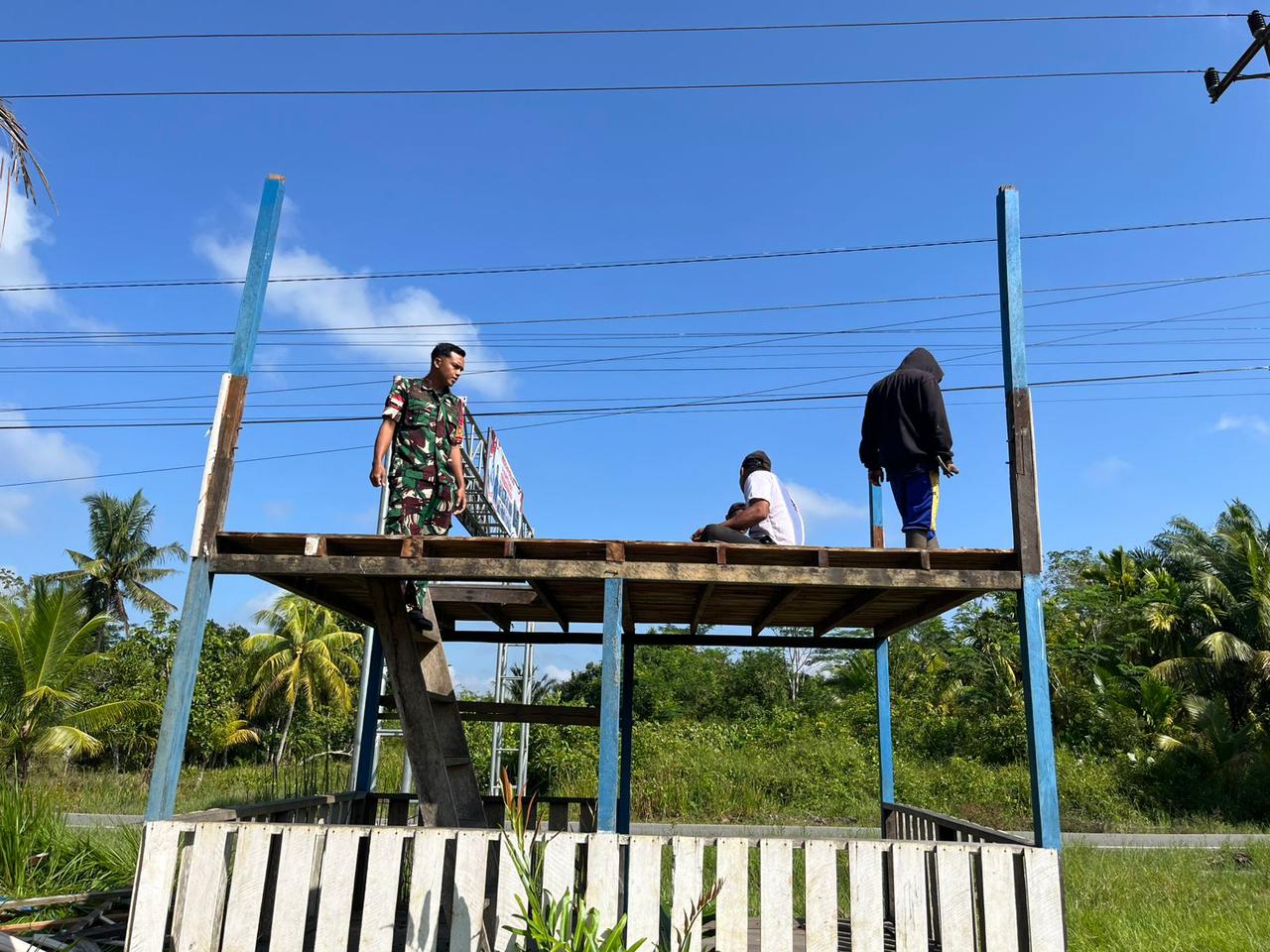 Sambas – Dalam upaya meningkatkan keamanan dan ketertiban lingkungan, Babinsa Desa Berlimang Koramil jajaran Kodim 1208/Sambas bersama warga melaksanakan kegiatan gotong royong merehabilitasi Pos Keamanan Lingkungan (Poskamling) di wilayah Desa Berlimang, Kecamatan Teluk Keramat,, Kabupaten Sambas, Sabtu (14/03/26).